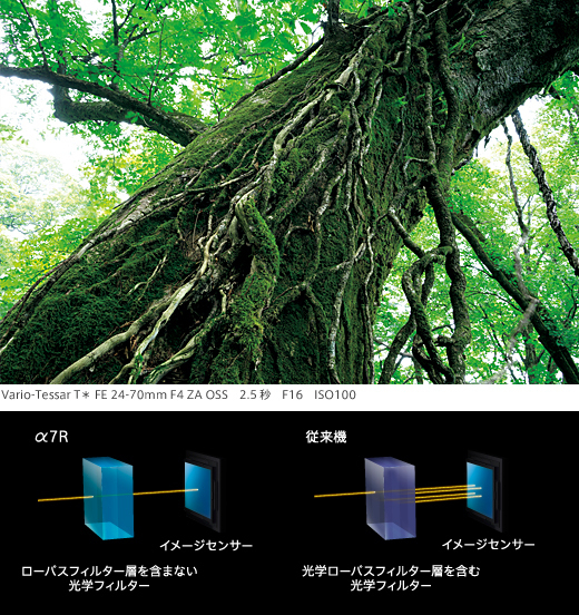 那么α7R传感器与尼康D800E相同?单纯从像素来看,两者确实比较相近,CMOS也均采用无间隙微透镜技术,但也并非没有差别。尼康、索尼 两家均宣称取消低通效果,但做法并不相同,索尼α7R应该与RX1R相同采用了不含有低通滤波层的光学滤镜,光线可以直接到达成像组件,与D800E有所 不同。也就是说索尼将第一和第二片低通滤镜去掉,仅剩下光学玻璃(不改变相位),但这些玻璃滤镜还要起到阻隔红外线作用,避免红外线对成像效果造成干扰。 从结构来说,索尼的做法更为直接、简单。