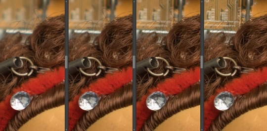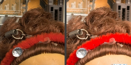 从测试结果来看,ISO50-ISO800的中低感光度下,两款相机画面保持比较干净,不过两款相机在曝光上存在差别,以ISO200为例, 同样F8.0光圈,索尼为1/5s而尼康则是1/3s,尼康由于曝光时间更长画面更亮,由于曝光倾向不同以上对比仅作参考。在ISO 1600时两款相机的RAW均出现轻微噪点,但不明显,D800E由于画面更亮,暗部噪点要好一些。ISO上升至ISO3200,两台相机的RAW噪点开 始明显,颗粒稍有粗糙,娃娃发丝边缘细节有所损失。到了ISO6400两款相机的噪点都非常明显了,不过都没有出现彩色噪点,至于ISO12800- ISO25600细节已经损失严重,噪点很多,实用价值不高。RAW下索尼α7R与D800E的噪点控制基本在同一水平线上,只不过由于尼康曝光时间更 长,造成画面更亮,让暗部噪点不那么“扎眼”。如果设置为JPG,索尼的降噪效果会更为“干净”,比起尼康高ISO(6400以上)降噪产生色块,感官上 会更好一些。