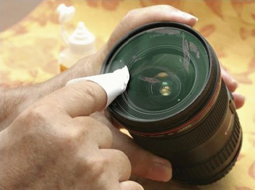 5.使用气泵清洁镜头表面的尘埃,如遇有手指印,可以用柔软而清洁的镜头布擦拭,如遇有不能抹走的污渍,可以用小量水蒸气沾湿镜头表面,以圈状的动作由中央向外边擦拭,小心勿留下痕迹及勿触摸镜片的其它部份。