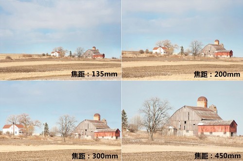 从图2-1中可以看到随着焦距变大,画面的范围逐渐变窄,同时远处的房子也变得越来越大。总结一下,我们可以得到如下的结论: