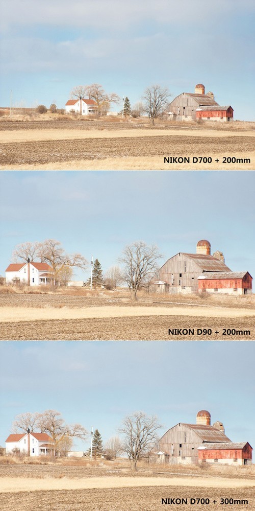 从图中我们可以看出一个200mm的镜头在APS-C画幅机器尼康(Nikon)D90上拍摄到的范围与一个300mm镜头在全画幅机器尼康(Nikon)D700上一致。