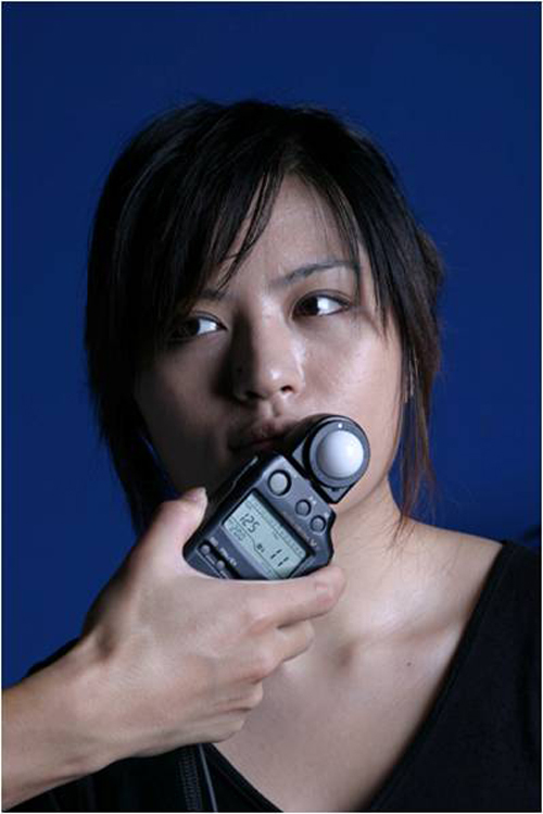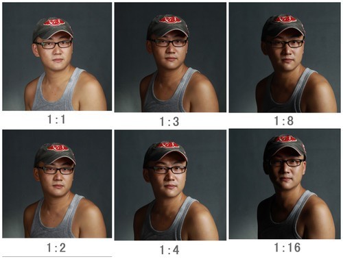 使用具有手动功能的照相机也能精确的测算。以恒定快门对亮面和暗面分别做点测光(要注意白加黑减的测光原理),所得亮面与暗面的光圈值。当光圈 值相差一档时,表示亮区的受光是暗部的一倍,光比为1:2。相差两档光比1:4;三档光比1:8;四档光比1:16……以此类推。超过一档不足两档的为 1:3,这里并不需要太过精确。