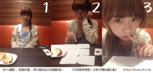 3、请女友像自拍时候一样下巴收起来靠近桌面,将镜头挪近使画面尽可能填满,就有水汪汪的大眼睛了!