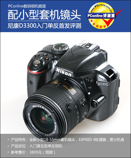 尼康D3300是尼康在CES2014大展前发布的一款定位入门级单反的机型,最大亮点是配备了全新的DX格式2416万像素CMOS传感器,并在机身外壳上下了功夫,使用了含碳纤的混合材质和箱子式结构设计,在机身坚固度不变的情况下,拥有更轻、更小的机身。而屏幕使用了3英寸92万像素LCD的高分辨率屏幕,还搭载了全新的EXPEED 4图像处理器、支持无线传输器等等。