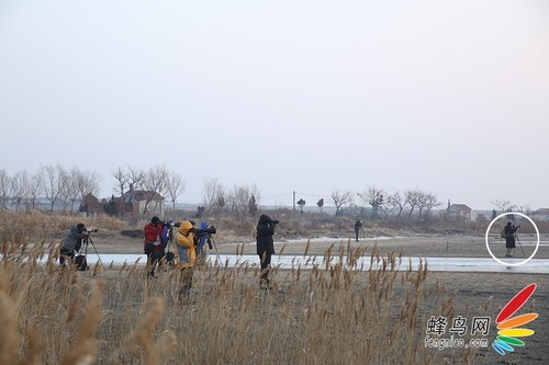 在实际拍摄的过程中,我们就遇到了拍摄者距离过近而对天鹅产生惊扰的情况。如上图所示,画面右侧边缘的拍摄者(白色圆圈内)距离天鹅过近,而对天鹅造成 了惊吓。尽管这个拍摄者并没有使用过激的方式(如大声恐吓、驱赶)惊扰天鹅,但是还是最终导致整群的天鹅不敢上岸觅食。对于这样的行为,我们认为并不是偶 然出现的。在此我们也提醒鸟类摄影爱好者们在拍摄时要和动物保持较远的距离。
