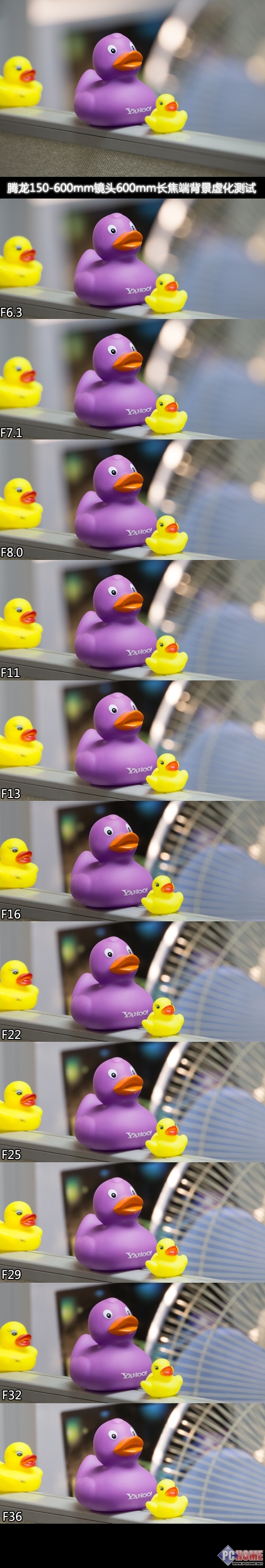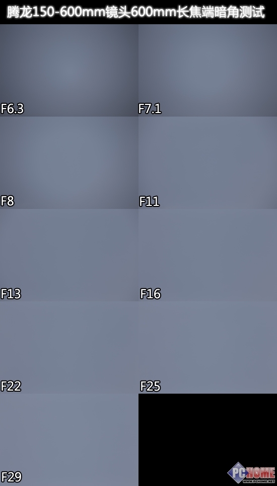 再来看看600mm端,最大光圈F6.3和F7.1下都有比较明显的暗角,到了F8.0时暗角明显减淡,直到F11时暗角肉眼几乎就很难察觉了。