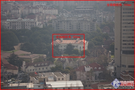 先来谈谈600mm究竟是什么概念?由于笔者手里拿到的是佳能卡口版本的镜头,接到佳能EOS 6D机身上为例,小编通过在公司江苏路延安西路口的26层楼顶天台拍摄了远处兴国宾馆的对比图,分别用150mm和600mm进行对比,这样就可以有一个比较清晰的认知了。