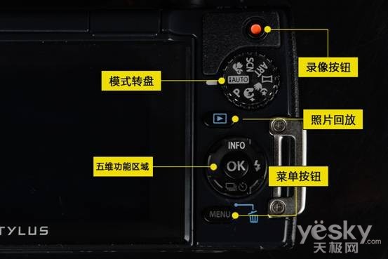 最后再显示屏旁边依旧是主要功能操作按键区域,包括有录像按键、拍摄模式转盘、照片回放、五维功能盘和菜单按钮。这种设计比较大众化,消费者在使用方面也非常方便。