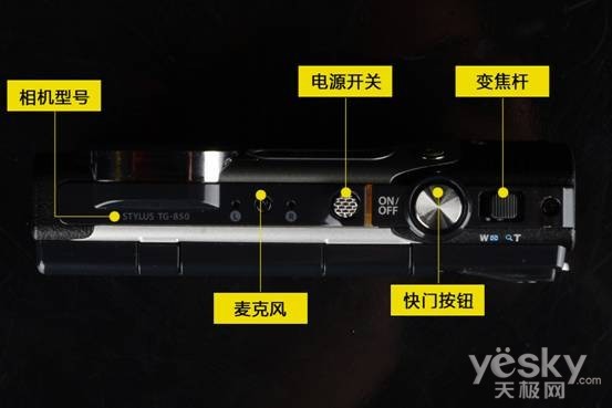 奥林巴斯TG-850的机身顶部则是一些常规的设计,从左至右分别是麦克风、电源开关、快门键和变焦杆。简洁大方的设计,非常方便消费者的使用。
