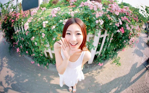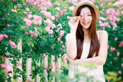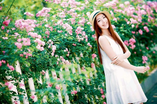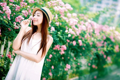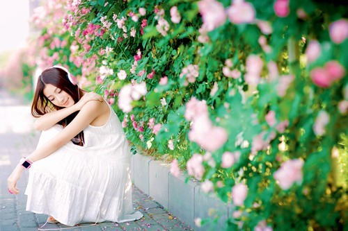 花墙前拍摄女孩清新照,最根本的就是不要让花抢去女孩的光彩,同时又不要让花成为单纯的背景,结合环境营造花海气氛。