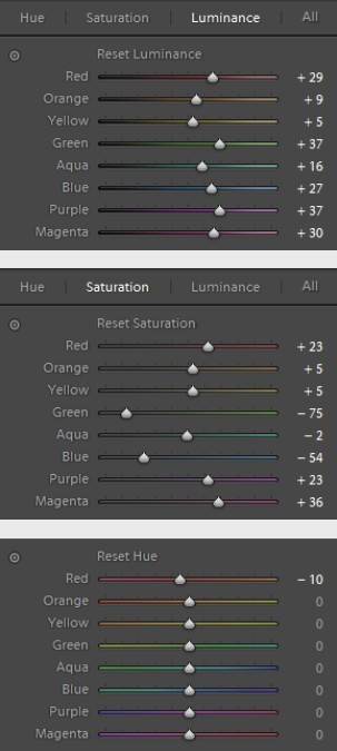 思路:画面的组成颜色,红色,黄色,橙色居多,我们要一定程度上提升橙色的饱和和亮度,让肤色和画面更温暖,提升红色来让嘴唇的皮肤更红润,提升黄色让逆光和背景更温暖,同时减少蓝色和绿色的构成,让色调更统一。参数如下: