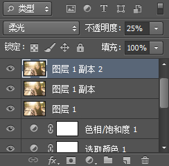 盖印图层,复制一层,图像混合模式选择“柔光”,降低不透明度到40%,得到图层1副本。之后在复制这一层,并减低不透明度到25%,得到图层1副本2。