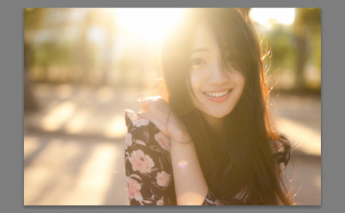 一般来说,拍摄大逆光的人像照片,很多人都是采用欠曝的方式来保留细节,我之前也是如此。但往往修图的时候就会发现这些照片的“光感”不如自己看到的画面 好,如果要是借助光效插件来增加光源就舍本逐末了。所以我一般选择“所拍即所得”,尽量按自己看到的样子来曝光,甚至可以过曝一点(不能太多,否则出现高 光死白),利用实时取景功能(佳能相机为例),我们可以方便的对焦和调整曝光。