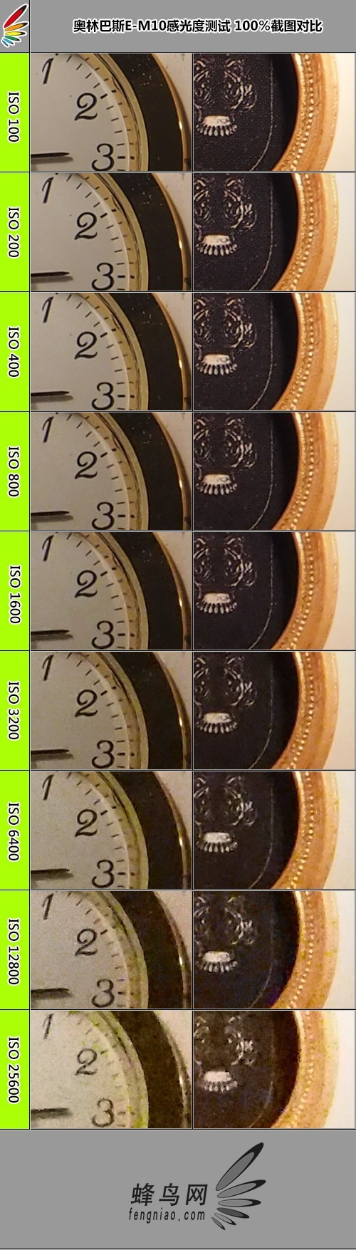 通过感光度测试可以看到,E-M10在IS0 100-800的时候,均呈现出了细腻的画质,画面细节得到了充分的体现。在ISO 1600的状态时,画面上已经出现些许的涂抹感,不过对付日常使用完全不成问题。随后随着ISO的逐级提高,画面中的噪点开始逐渐增多,画面质量也随之下 降,而在最高值ISO 25600的时候,画面细节损失严重,仅在极端情况下可以应付拍摄。这里需要说明的是,E-M10的实际ISO范围为200-3200,其余各档均为扩展 ISO。
