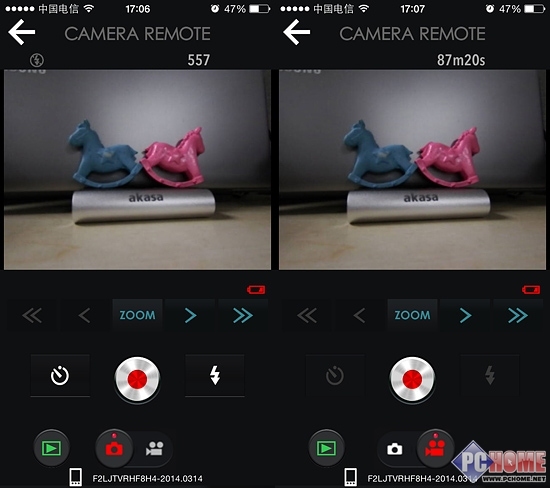 首先我们来看一下遥控相机(无线快门线)这个功能,我们可以在手机上实时监控到相机所可以拍摄到的景物。通过它我们还可以对相机进行无线对焦、变焦以及闪光灯的控制。请留意画面右上角的部分,通过静态照片或者视频拍摄的切换该软件还能提供给我们可以拍摄的张数或者视频可录制时间的提示。