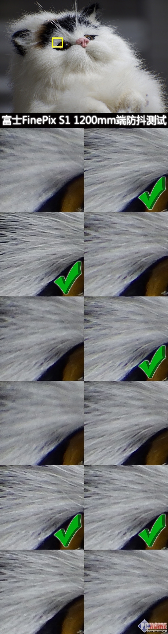 我们把焦点,也就是猫咪眼睛附近进行100%的截图排列发现在仅仅1/15秒的快门速度下拍摄成功率达到了4成。