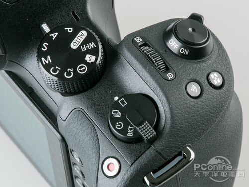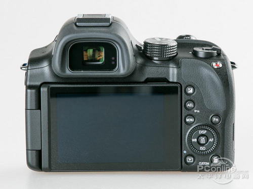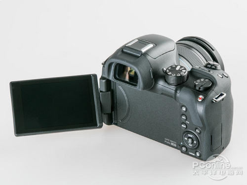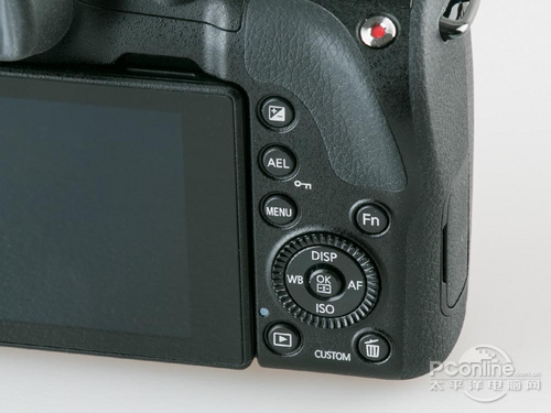 对应机顶按键的改动,机身背面的按键当然也需要重新排布了。与大部分无反相机一样,因为背面按键空间预留位置不多,所以,按起来还是有点拘束的。而五维键上的转盘 在单手操作时比较难操作,太靠边缘了,如果能和五维键分开,并设计在曝光补偿键上方会好不少。