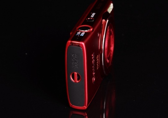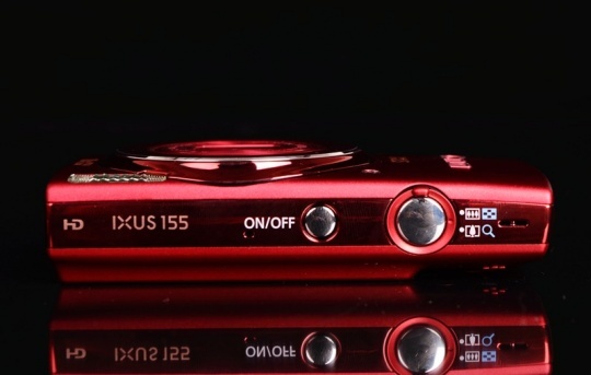 相机的顶部设置了电源开关和变焦对焦按钮,采用了银白色与红色镀铬工艺相结合,在光线照射的情况下非常漂亮。顶部左侧标有HD IXUS 155字样,表示这是一台具备了高清视屏拍摄能力的相机。
