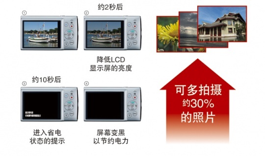 像IXUS 155这样的小机器平时使用最大的问题可能就是续航能力了,因为机身体积的需要,相机的电池不可能做的很大,容量上的限制让相机的拍摄张数不会太多。因此 佳能为IXUS 155专门设计了一个ECO节电功能,在不使用相机约2秒后,屏幕会变暗;再过约10秒后,屏幕会关闭;不操作相机约3分钟后,相机会自动关机。当开启节 电功能后相机可多拍摄约30%的照片。这个ECO可以智能的为用户节省不必要的电力,很多用户在打开相机电源后可能就会忘记关闭,ECO就可以自动关闭电 力,当用户想拍摄时又可以迅速工作,这就像电脑上的休眠功能非常类似。
