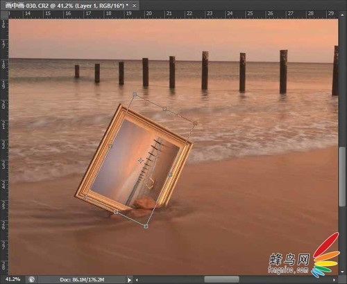 按【 Ctrl+A】组合键选取整个图片, 按【 Ctrl+C】组合键复制全图,然后重新载入前面保存的选区,选择“菜单→编辑→粘贴入”选项, 快捷键是【 Ctrl + Alt +Shift+V】。 再按【 Ctrl+T】组合键调整大小和角度(图6-12)。其实我们还可以重复一次步骤3,再一次复制,粘贴,继续做相框内的相框,就可以实现画中画嵌套效果 了,不过那样就很小了,意义不是很大。