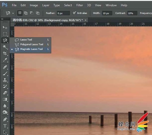 3. 选取选区, 在Photoshop里面通过快捷键【 L】或者在侧边栏选择Magnetic Lasso Tool魔术套索工具。然后按下 【Ctrl + +】组合键或者使用快捷键【 Z】配合鼠标, 放大相框充满整个画面,做类似这种处理的时候,相对大的显示器就更容易精准处理,直接把羽化值设置为5px,一次没有选好,没有关系,利用不同的套索工 具,配合【 Ctrl】或者 【 Shift】键调整选区,得到如图的效果,记得保存选区备用。