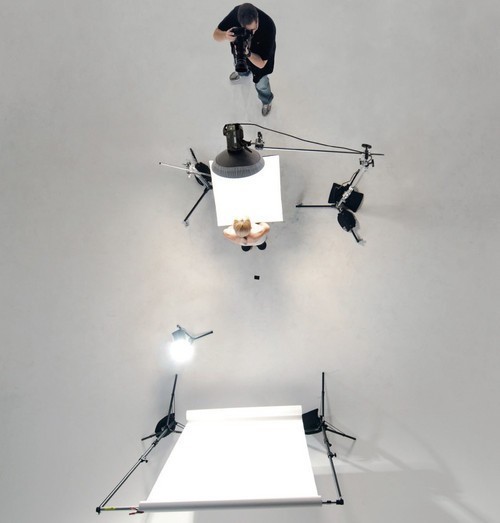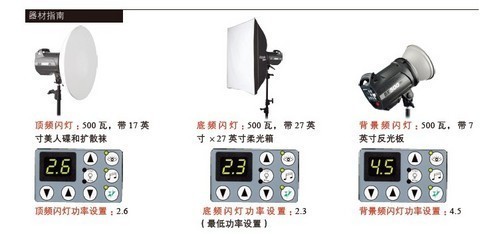 有时您会听说这种双灯布光方案叫做“蛤壳”布光,因为从这边看双灯像一个张开的蛤。如果您没有第二盏灯,也可以让模特手持一块银色反光板。反光板放在胸部的高度,用来反射顶灯的光线。