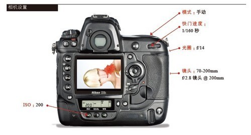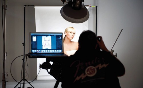 我站在模特的正前方。顶灯上安装了一个美人碟(就像柔光箱一样固定在灯头上),美人碟的前面罩上一个扩散袜以使光线变得柔和一些的同时还保持一定硬度。顶灯放在很高的位置,朝后以45°角照在模特上;顶灯离模特非常近(这在其他几张图中更容易看清楚)。