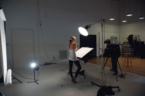 另外一盏附带美人碟和扩散袜的频闪灯用来做主灯, 摆在模特的正前方。另一盏带27英寸柔光箱的频闪灯朝上照亮模特,给阴影区补光。