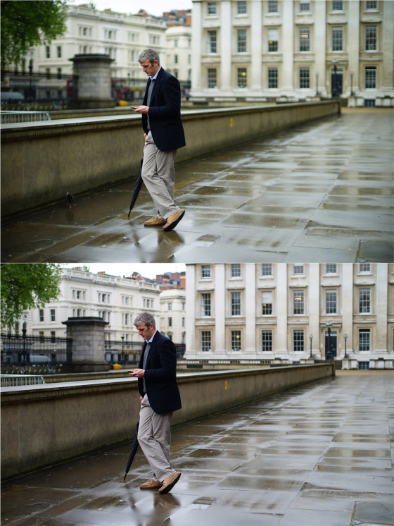 同样的,在大英博物馆门前拍摄的这样人像,F0.95和F2.8的背景虚化完全不同,上图显然看起来更有“电影感”。而且我们也发现暗角的加入甚至是照片色调的变化(色温降低)也使得上面这张图片给人的感觉更好——尽管有人会觉得焦外有一些散乱但我相信大部分人都会喜欢第一张。