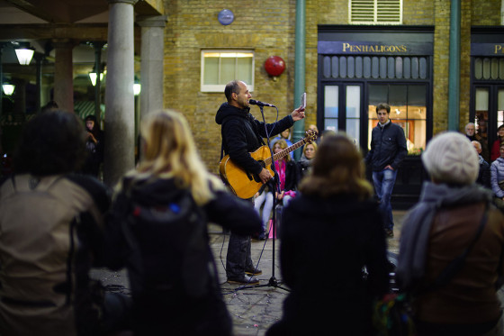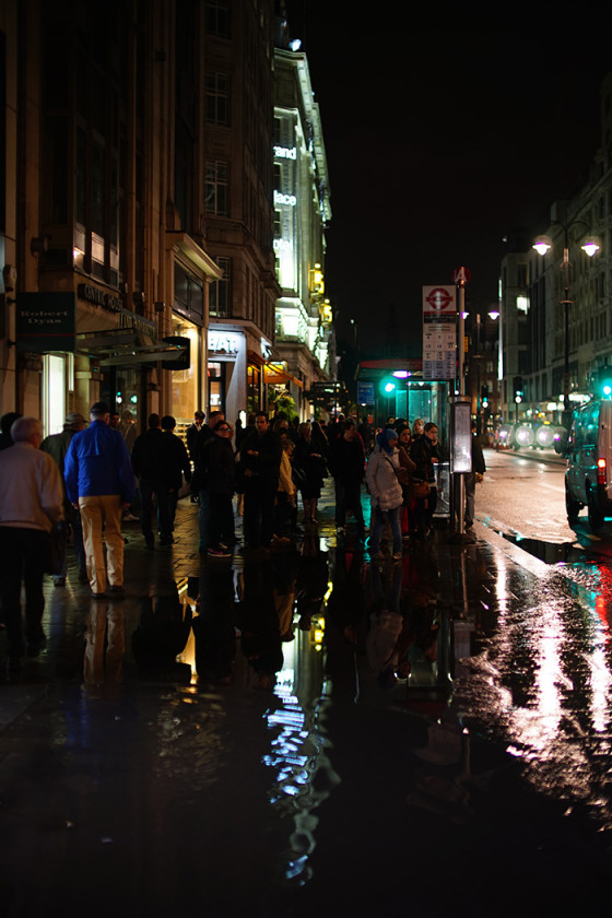 这里还有几张我使用F0.95全开光圈拍摄的画面,有些比较好的烘托了环境氛围和现场气氛,比如长凳上玩手机的女生以及夜间贩卖自己弹唱CD的卖艺人;有些则因为景深太浅而让人无法清楚辨识环境,比如梧桐树嫩叶后的皇家海军学院建筑基本就是白茫茫一片。