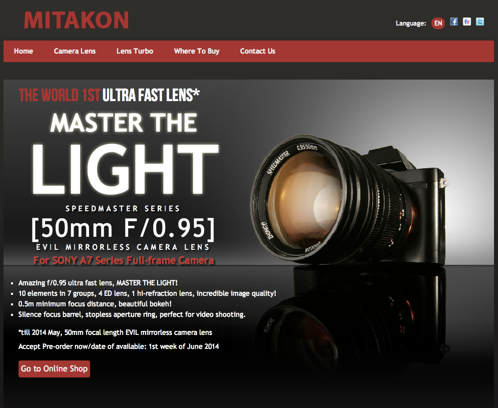 注意,由于沈阳中一光学(切勿错认为‘沈阳第一中学’什么的^_^)在海外使用的是美德康品牌,因此该镜头在海外预售时使用的官方名字是Mitakon SpeedMaster 50mm F0.95,题图照片也是来自于其海外官网(联系地址为香港):http://mxcamera.com/mitakon/en/mitakon50mm095.html而在其国内中文官网上该镜头尚未列入名录。在本次北京PE2014展会上,中一光学实验性的现场销售了一批本镜头,同样是无正式包装(只有两片保护海绵)的版本。不过从镜头本体做工来看,实际应该已经是完成度很高或者达到市售标准了。