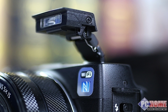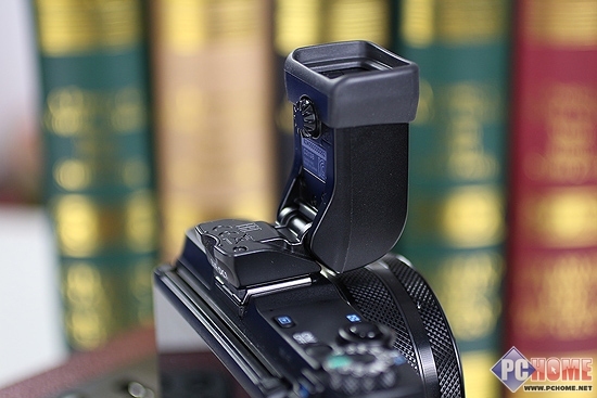闪光灯弹出状态下的机身正面效果图。可以手动干预让闪灯方向朝上完成跳灯的功能。