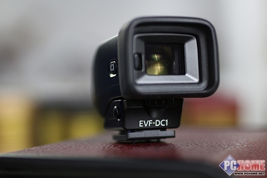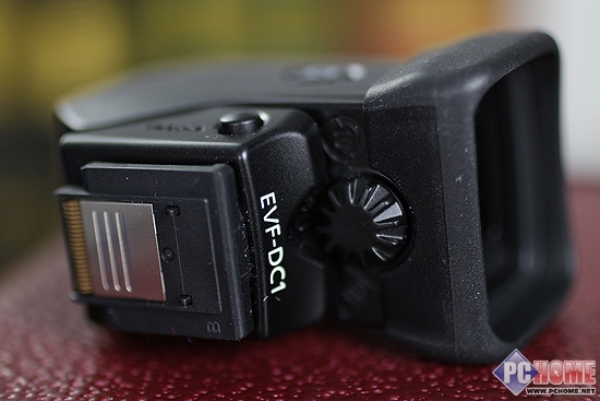 我们可以看到图中的两个按钮,画面上面的那颗是解锁按钮,把EVF-DC1从机身上拆下来就要先按住这个按钮。另外一个类似齿轮状的就是屈光度调节按键,它的作用无需言表。