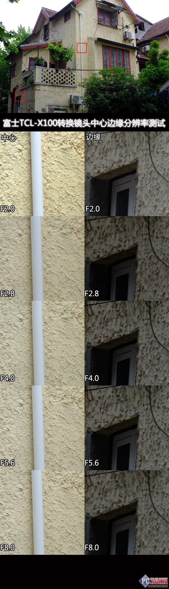 测试环境:将相机固定在三脚架上对远处场景分各档光圈进行拍摄,与此同时对中心和边缘的红框区域进行100%截图。