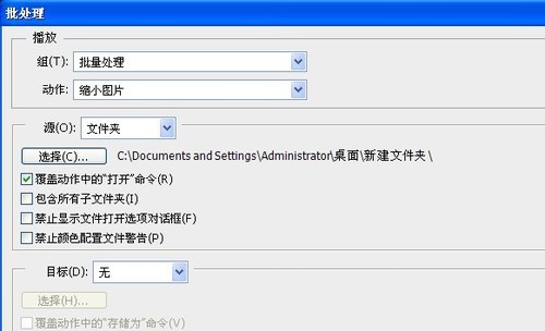 第八步:奇迹就从这里开始,依次点击→文件→自动→批处理→批处理面板→在组合上选择“批量处理”→动作选择“缩小图片”。