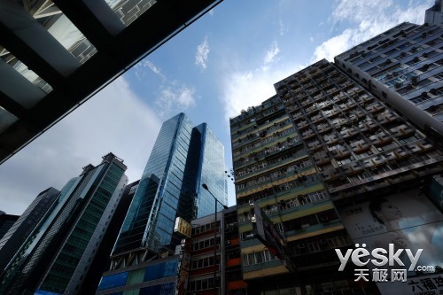 香港是一个高度化发展的国际性大都市,街边高楼紧凑,街上人头攒动,这就很考验设备的对焦性能了。富士X-T1的最快对焦速度仅为0.08秒,而富士XF10-24mm F4 R OIS镜头采用了经过改进的内置对焦系统,从照片中可以看到,即便不依靠对焦辅助灯,镜头都能很精准、高速的完成对焦。