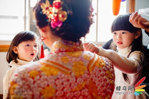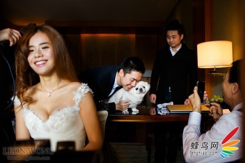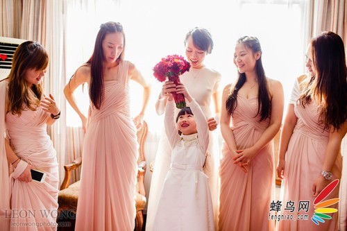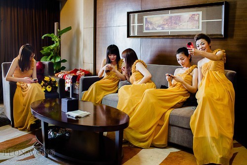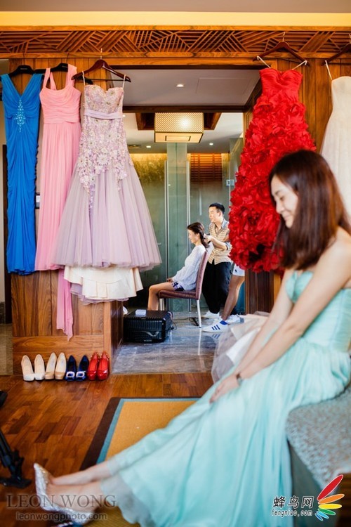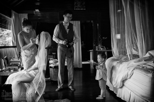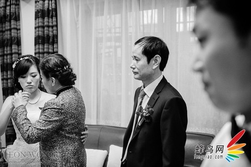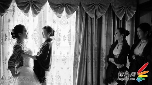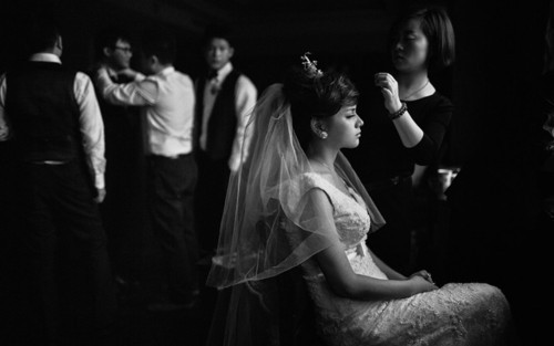 我曾说过,镜头是可以被摄影师赋予情绪的。比如,我对婚礼准备阶段的感觉会用镜头来表达。准备阶段(新人化妆、亲人伴娘的准备过程)虽然人物内 心可能是很波动复杂的,但相对来说外在形式比较平静,整体活动的节奏也比较慢。它对我来说更像35mm、50mm这种平实的感觉。我会用35mm记录包括 主要人物、环境背景在内的场景,完整诉说这个场景中人物之间的关系,人物与环境的关系。这样大大增强了单张照片讲故事的能力。