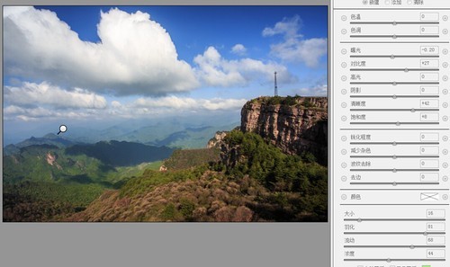 第三步,进入基本调整栏里进行整体调整,我的习惯是先点击“自动”,让程序自动计算片子的调子,然后在细微调整。这个片子自动调整后,整体感觉 还是不错的,色温正常不需要调整。有两处需要修改,一个是云的亮部细节不够,再者就是右下角暗部细节不够,我就降低了高光参数,提高了阴影参数,是高光和 阴影的细节都能够充分的显现出来。然后我调整了白色和黑色参数,让白的更白,黑的更黑,增加了整体片子的通透性。最后我调整了清晰度、自然饱和度,微调了 饱和度,以增加整个色彩的纯度。