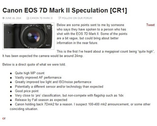 除了在外观上的变化,根据目前的消息,7D II将搭载高像素传感器,大幅提升对焦性能以及高感表现,很有可能会和新的100-400mm镜头一起秋季发布,而且价格也会很“亲民”。