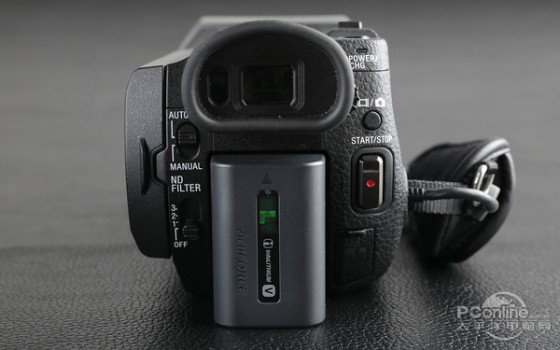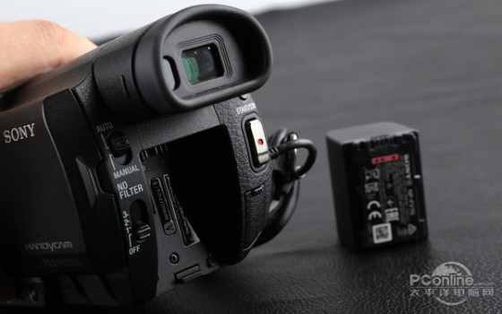 尾部的电池仓占据的一大部分,右侧是机身的摄录按钮、模式切换、拍摄显示灯和电源接口,左侧是AX100E内置的ND调节,两个ND滤光片用于调节通过镜头进入影像传感器的光量,根据不同拍摄条件需要,可以提供1/4、1/16或1/64滤光片选择。