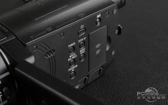 机身液晶屏内侧是机内菜单的各种常用快捷按键,这里要特别提到的是AX100E的"NIGHT SHOT"模式拍摄,就是说机身支持夜景模式摄影,这一点是笔者拿到手上发现的第一个非常实用的功能,在全黑的环境下可以直接拍摄,后面样片环节会送上样片,各种按键的后面是AX100E的储存卡卡槽,AX100E支持外部SD卡的扩展,需要注意的是,储存卡速度需要Class 4 或以上,要拍摄4K视频的用户,需要Class 10/ 64GB及以上容量的储存卡才能正常拍摄,这一点对于现在低容量卡比较普及的情况下不是太方便。