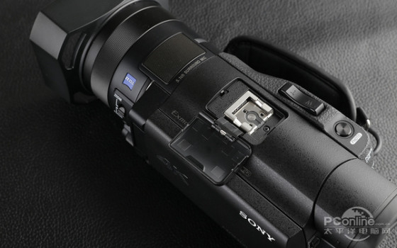 AX100E机身顶部配备了麦克风、变焦按钮、拍照按钮及可扩展热靴接口,可以根据自己的需求进行相关扩展。使用这里的变焦拨杆可以让视频的变焦过程更加流畅,后面的拍照按键在手自然握持摄像机时,可以触手可及,非常方便。