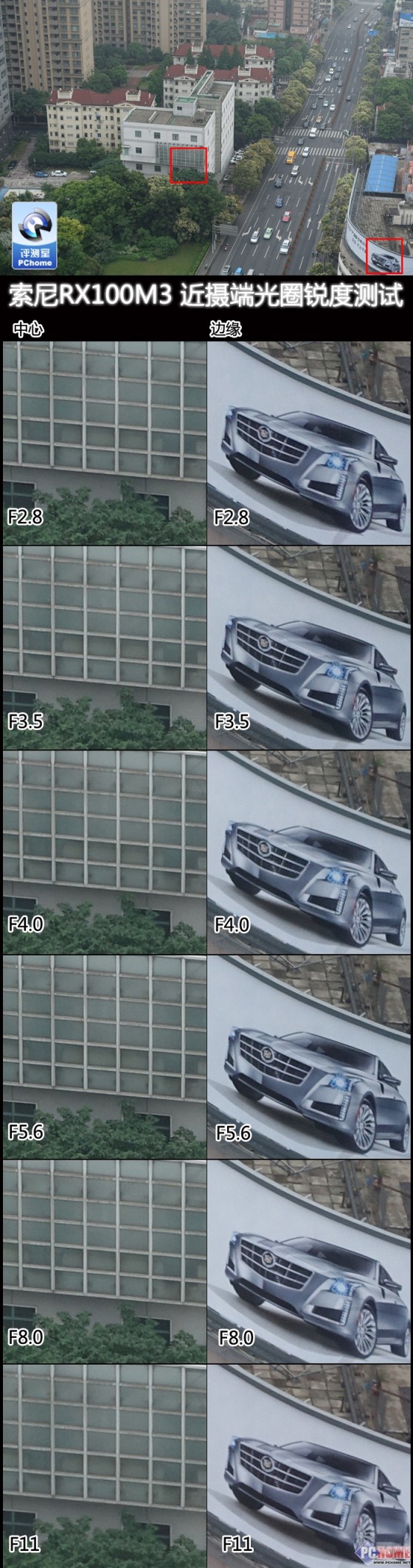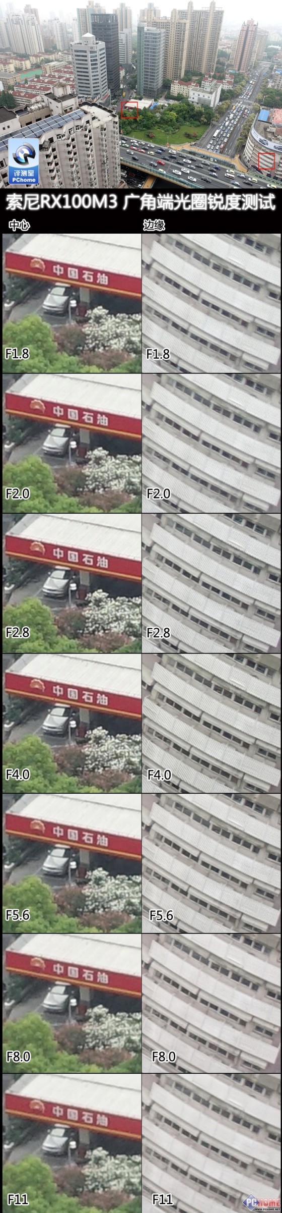 索尼RX100 M3的24mm广角端相比近摄实力有些不一样的感觉,近摄的表现可说是循序渐进的锐度加强而远摄广角下的实力则表现为梯子型状态,中心画质F2.8至F4.0表现最佳,边缘画质也是如此。F5.6之后开始下降明显,字体和墙体纹理细节开始丢失。