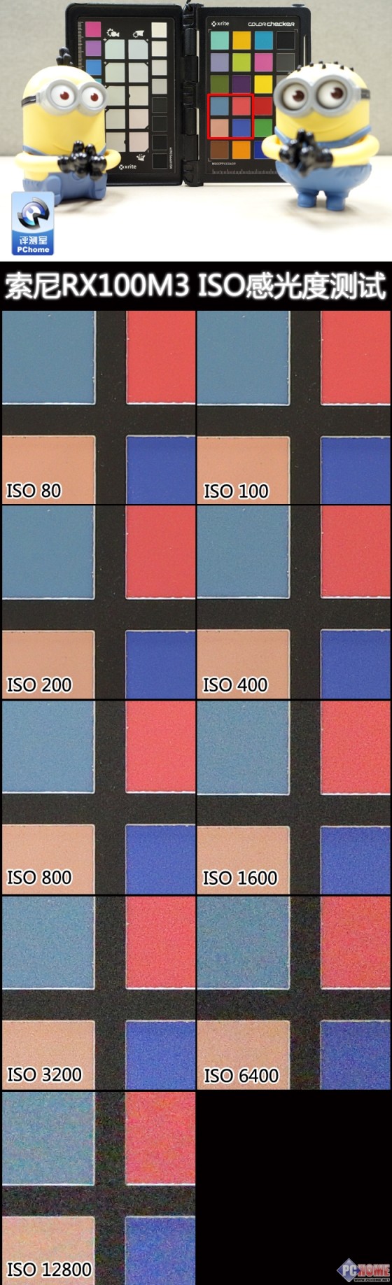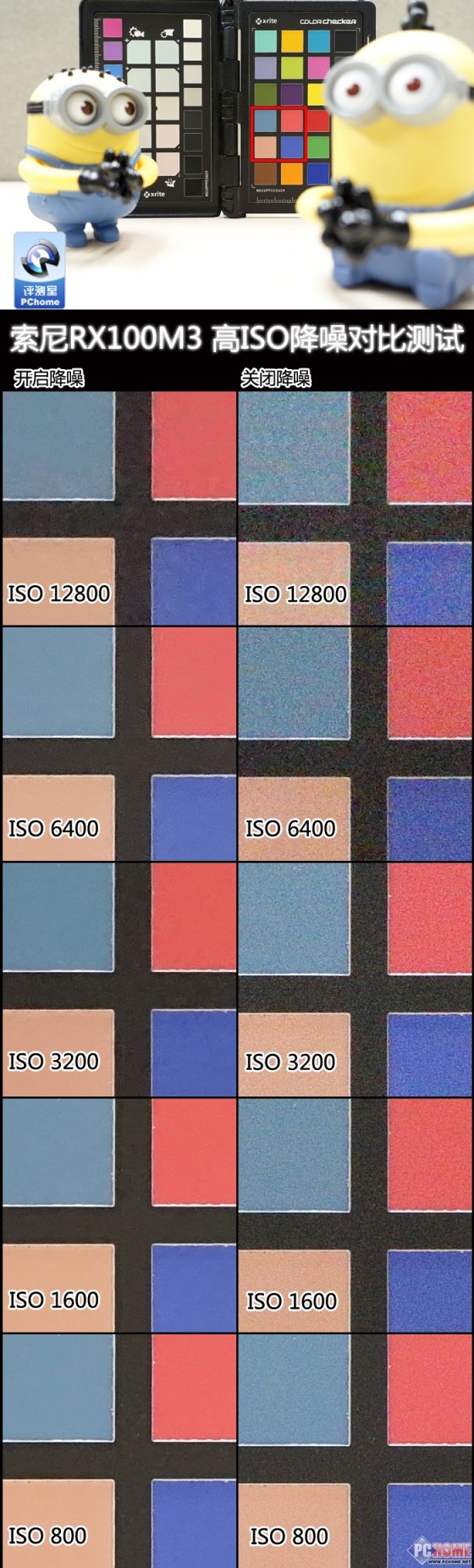 索尼RX100 M3的最低感光度仅为80,最高可达12800。首先关闭机内降噪模式,经过测试当ISO低感80至400时细节表现整体堪称完美。ISO开至800时开始出现轻微噪点现象,ISO1600时处于风水岭颗粒感更为明显,之后ISO3200至12800红蓝噪点急速加剧中,虽然ISO升至最高但是区域色彩并没有随之改变画面整体颜色。