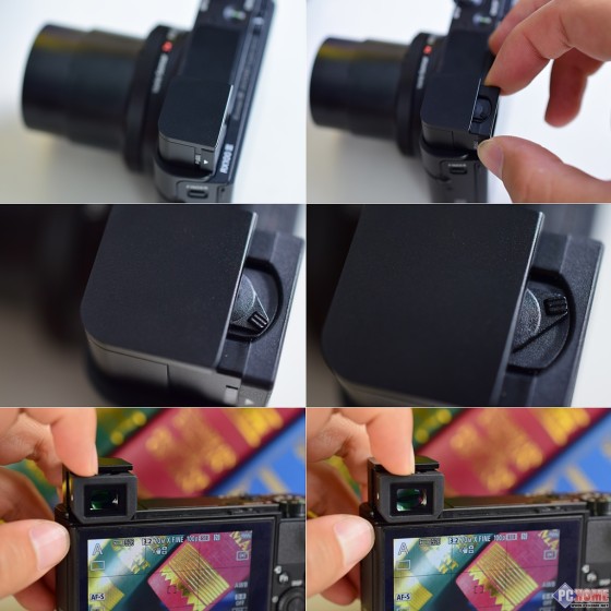 RX100 M3小巧的机身造型原本就已经够亮骚了,随着EVF取景的升级可以说又加上了一股风骚劲,这个开关很有意思,隐藏的极为隐蔽。在关机状态下根本就发现不了里面还有那么有深度的高科技玩意,通过机身左侧的开关按键一推,EVF自动弹出,然后只要顺手拉出取景眼眶即可工作,麻雀虽小五脏俱全逆天的是居然还有屈光度开关调节!似乎这次索尼做的实在太厚道了。