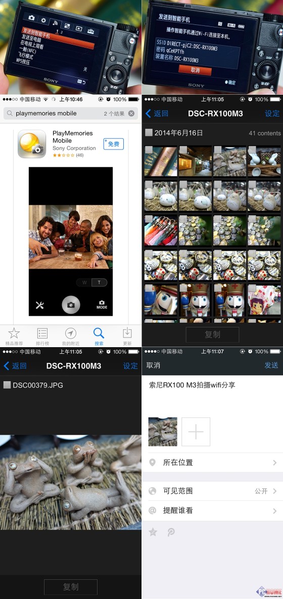 索尼RX100 M3配备了当下主流的WI-FI无线传输功能,经过体验感觉十分方便,装载APP软件之后即可完成整个传输过程,并且在APP之中我们可以智能遥控、延时以及照片效果的修饰都可以通过软件实现快速完成,真正免除了再次购买WI-FI SD存储卡以及修图难的困扰,置身美景之中发送微博或是微信"晒照"就是那么轻松。