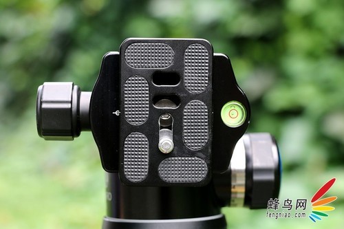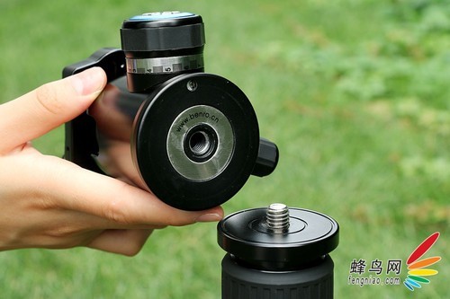 云台底部采用标准的3/8螺口,底部直径为58mm,我们可以清楚地看到云台底部标有百诺的官方网址。云台承载板采用了创新的内坩式专利设计,配合锁紧螺丝可以为承载板提供更为稳妥的固定。