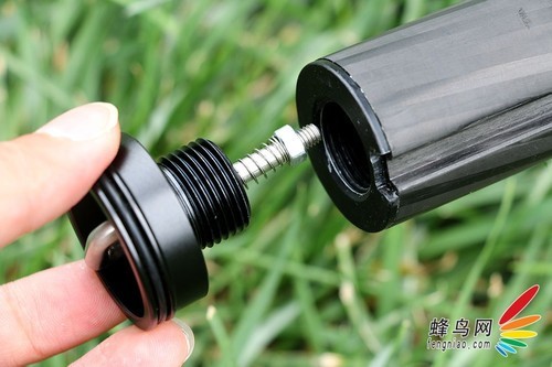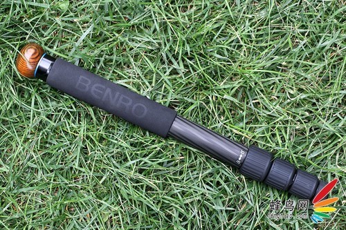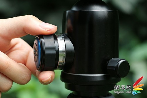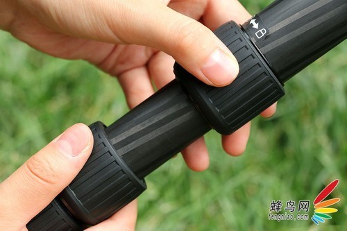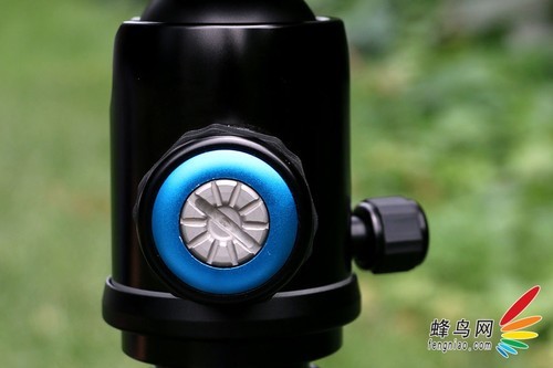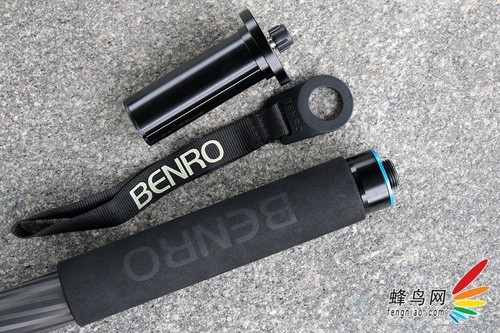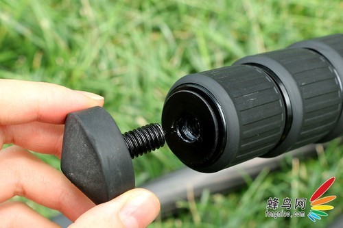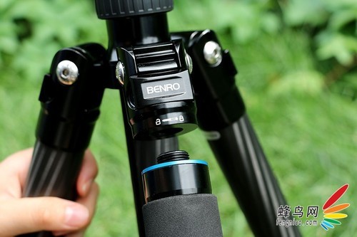 脚管上的海绵垫设计是比较人性化的,尤其是在温度较低的季节使用时,海绵垫具备防寒、耐滑的作用。我们看到这款三脚架设有海绵垫的脚管上有一个蓝色的金属环设计,蓝色金属环标志着可以通过旋转这支脚管拆卸成独脚架进行单独使用。