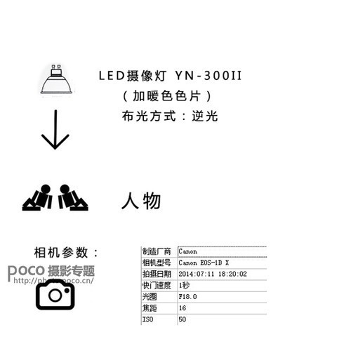 前期思路:前期布光采用暖色LED逆光照亮人物,配合三脚架,使用小光圈慢门拍摄,快门:1S, 光圈:F18, ISO:50。