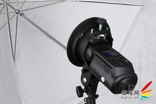 这款S型灯座另一个亮点在于拍摄者可以将柔光伞或反光伞插入闪灯固定处下方的伞孔内。而传统的闪光灯座安装了闪光灯后,闪灯的灯头与伞的中心的偏移量过 大,导致闪光不太均匀的情况出现。此外,这款S型灯座前部采用影室灯中比较常见的保荣卡口设计,变光工具的支持性更加出色。